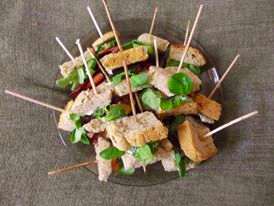 Coupez le pain, les tomates, l'oignon et le jambon en carrés. Composez le hamburger en ajoutant de la mâche avec une pointe de vinaigre. Retenez le tout avec des piques à brochettes.